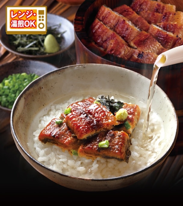 うなぎ(刻み)×2袋、たれ・わさび・刻み海苔・刻みねぎ・白ごま・白だし各3