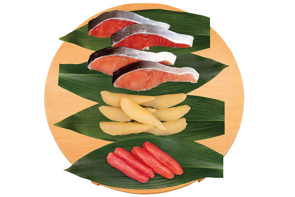 ●内容:紅鮭・白鮭 各70g×2(1切真空包装)、たらこ120g、 味付数の子(醤油味)100g